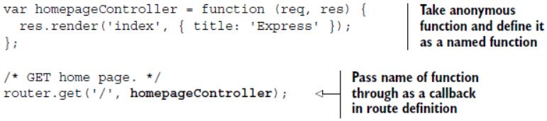 - Listing 3.2 (p. 67): Taking the controller out of the route: step 1