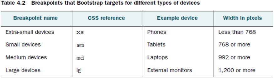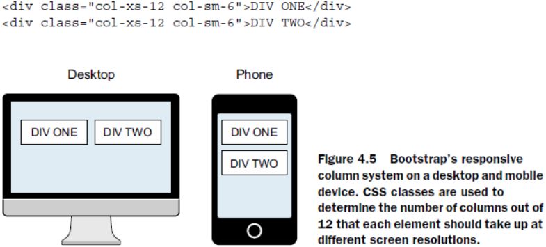 col-xs-12class tells the layout to use 12 columns on extra-small devices, and thecol-sm-6class tells the layout to use 6 columns for small devices and above.” (p. 89)