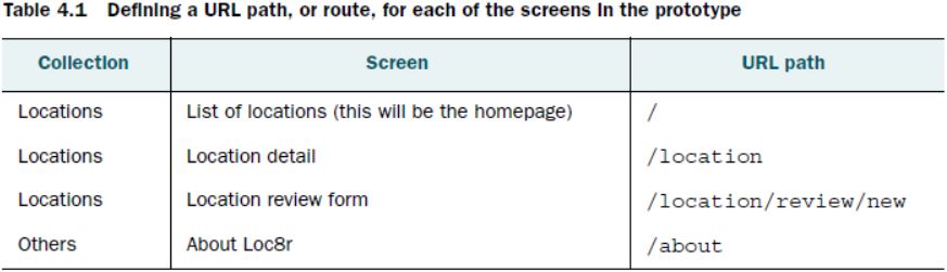 div with a class of container causes the content to be “centered in the window, and constrained to sensible maximum widths on large displays.” (p. 91)container div with the content block(1) Create a new view file: loc8r/app_server/views/locations-list.jade