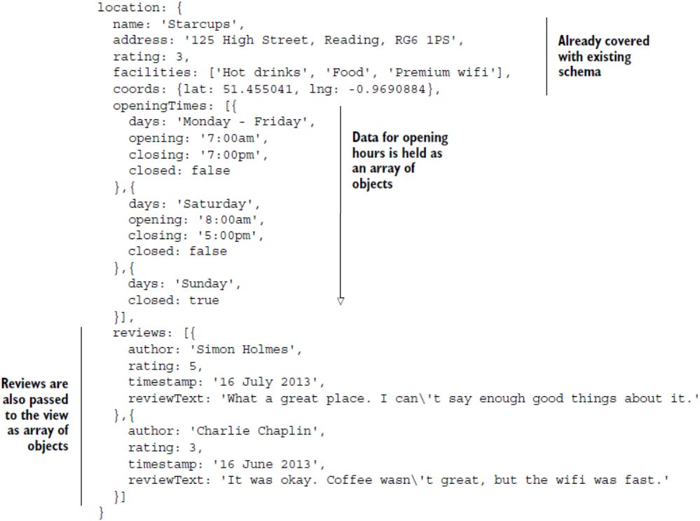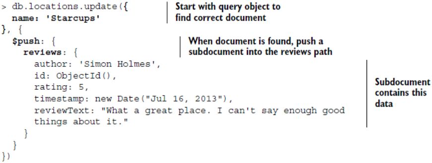 new Date command for setting the timestamp of the review. Using this ensures that MongoDB stores the date as an ISO date object, not a string — this is what our schema expects and allows greater manipulation of dates data.”
